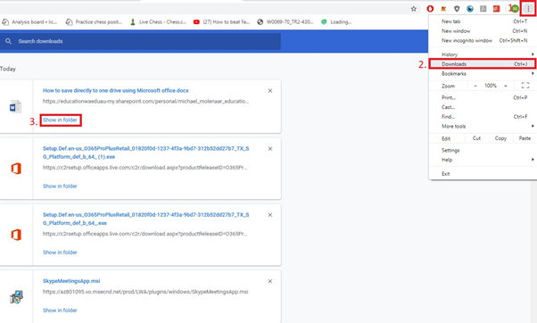 The document will likely be in your downloads folder. If you cannot find it, go to your internet browser and open your downloads. If using chrome, you can press CTRL + J or press the 3 Dots in the upper right, and select downloads from the drop-down menu. Locate the file and select “Show in folder”.