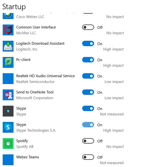 4. Turn off startup apps. Search for “Startup apps” in the search bar. It’s important to turn off the apps you will not use during your school day. Especially high impact apps. Apps such as Steam, Skype, Spotify etc.