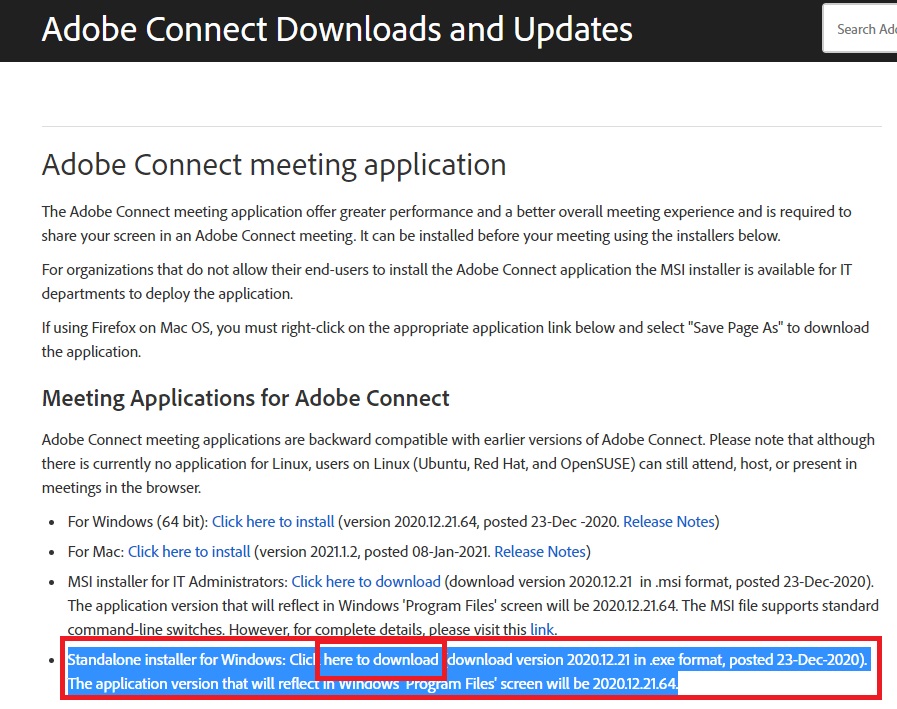 1. Go to your web browser and type in "Adobe connect download". Click the link highlighted below. https://helpx.adobe.com/adobe-connect/connect-downloads-updates.html